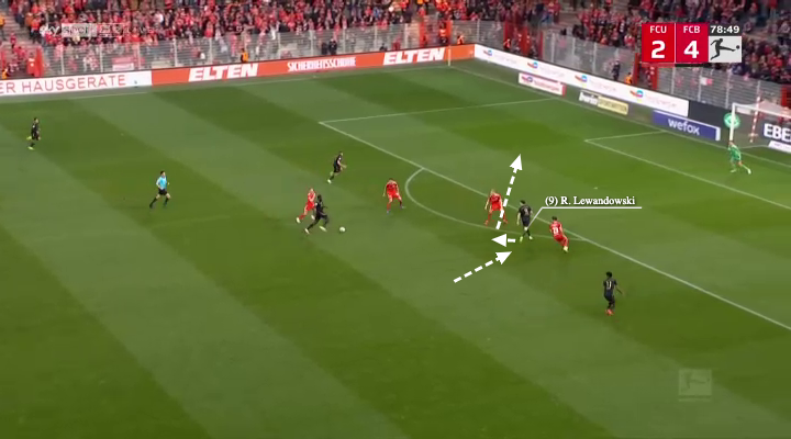 وقتی توپ از خط نیمه زمین عبور می‌کند، این فقط لواندوفسکی است که به سمت گروه منجسم سه نفره مدافعان می‌دود. قاعدتا نباید هیچ راهی برای عبور باشد. اما وقتی توماس مولر نفوذی دیگر را از سمت چپ شروع می‌کند، این مهاجم لهستانی برای صدم ثانیه به سمت توپ می‌آید و همین کافی است که دفاع را به دنبالش بکشاند، سپس به نفوذش به سمت فضای مقابل ادامه می‌دهد. هر سه مدافع فقط به او فکر می‌کنند و توپ به فضایی می‌رسد که به شکلی باورنکردنی وسیع و باز است تا مولر آن را به گل تبدیل کند.