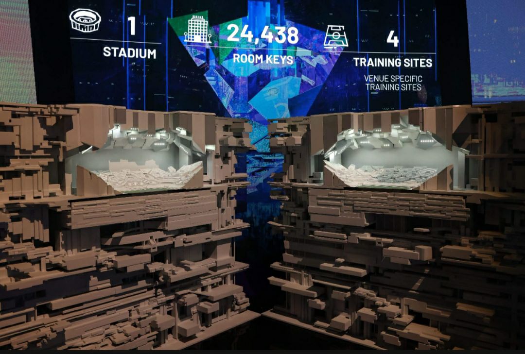 در سند پیشنهاد میزبانی برای سال ۲۰۳۴ ادعا شده که یکی از ورزشگاهها در نئوم، بالای پروژه لاین، در نیمکیلومتری از سطح زمین و حتی بلندتر از ساختمان امپایر استیت ساخته خواهد شد. طرحهای مفهومی اولیه این ورزشگاه پوستههای چندلایه و در هم قفل شوندهای را نشان میداد که با نور آبی نئونی میدرخشیدند. این سازه شبیه به ورزشگاهی بود که بازیکن ممکن است بتواند در بازی راکت لیگ انتخاب کند.