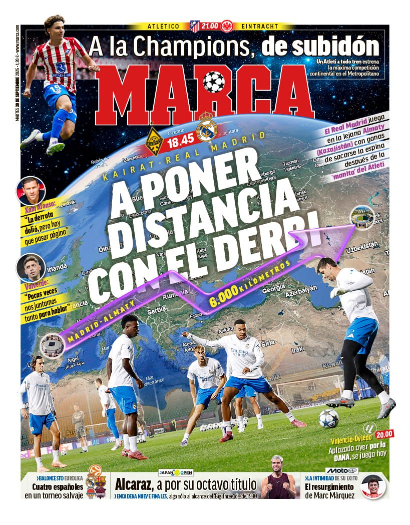 نشریه مارکا هم طرح اصلی جلد امروزش را به فاصلۀ شش هزار کیلومتری مادرید با آلماتی اختصاص داده است.