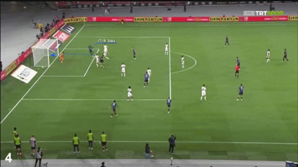 در ادامه نیمه اول، گیوکرس دست به کار شد و با یک حرکت زیبا به داخل زد و شوتی روانه دروازه کرد، و سپس در نیمه دوم در موقعیت بدون توپ، شدت بازی خود را نشان داد؛ عقب رفت تا توپ را به دست آورد، با قدرت خود را به پشت محوطه جریمه رساند و تقریباً ساکا را داخل محوطه صاحب توپ کرد.