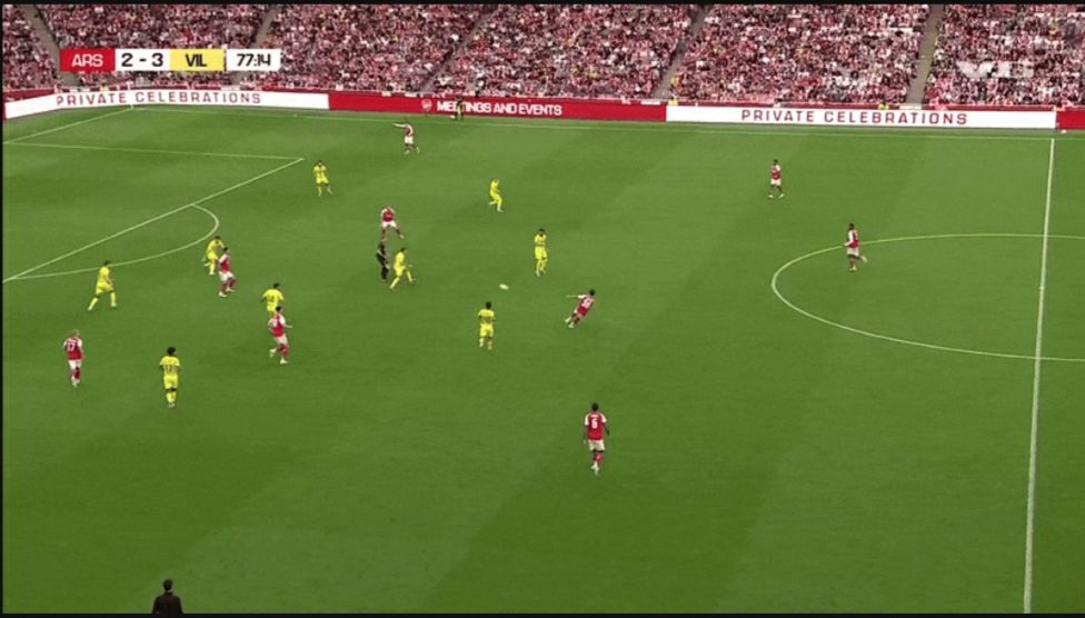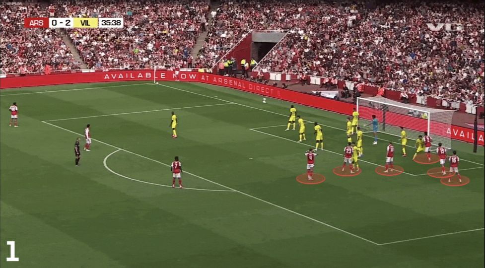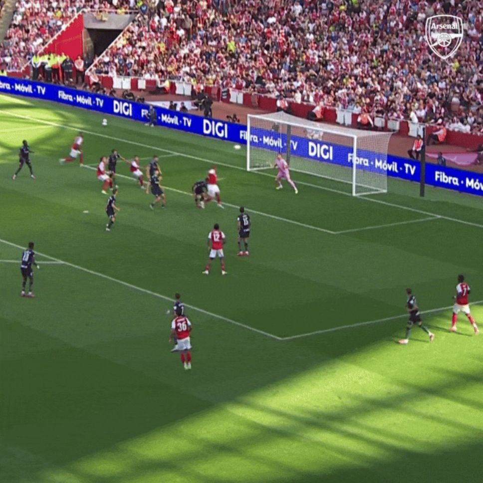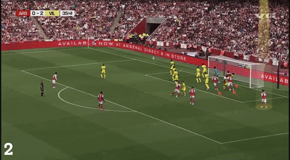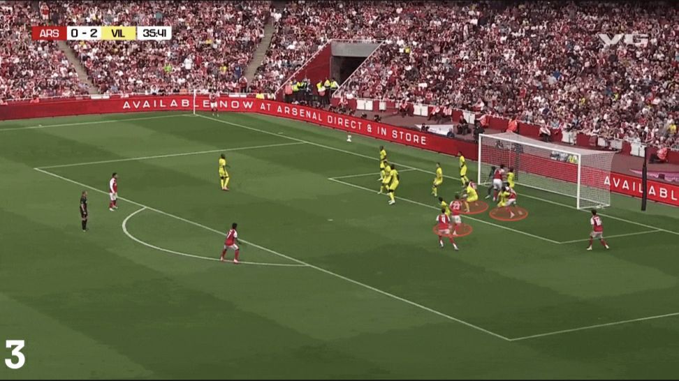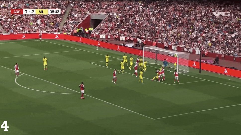 قبل از اینکه کرنر زده شود، شاهد تجمع شش بازیکن آرسنال به سمت تیرک عقب هستیم، سپس گیوکرس، کیویور و ویلیام سالیبا به جلو میدوند و نورگارد را پشت سر میگذارند. در قاب سوم، تلاشهایی که برای جلوگیری از بازگشت بازیکنان ویارئال انجام میشود دیده میشود، که به ملیپوش دانمارکی اجازه میدهد با سر توپ را وارد دروازه کند.