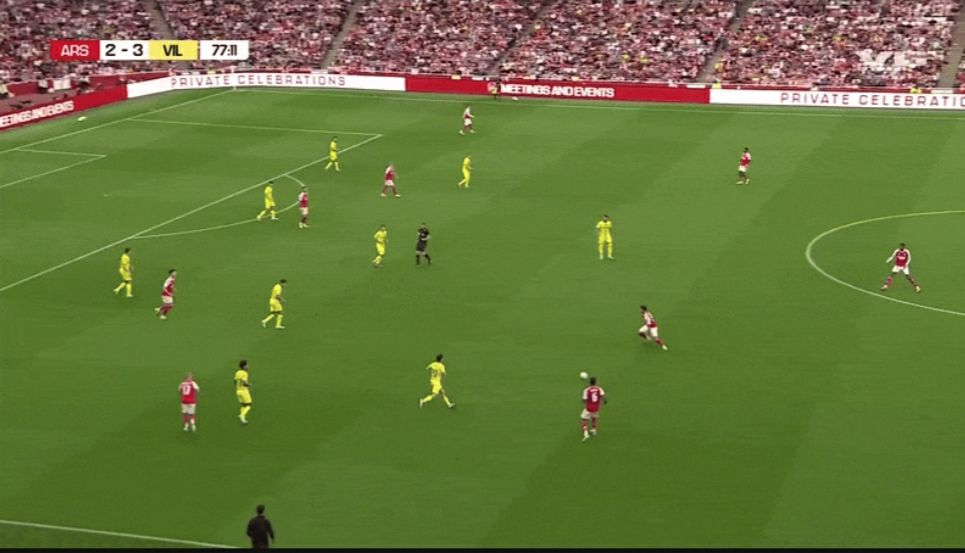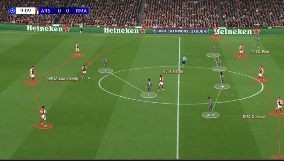برای مثال، در این بازی مقابل رئال مادرید، میبینیم مایلز لوئیس-اسکلی از سمت چپ به داخل حرکت میکند تا شکل 5-2-3 را شکل دهد و به عنوان دریافتکننده توپ در کنار توماس پارتی عمل کند، و اجازه دهد دکلان رایس و مارتین اودگارد پشت خطوط دفاعی دشمن پیش بروند. چنین ساختاری امکان اجرای پاسهای نفوذی از میان بلوک منفعل 2-4-4 رئال را فراهم میکند.
