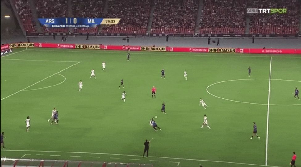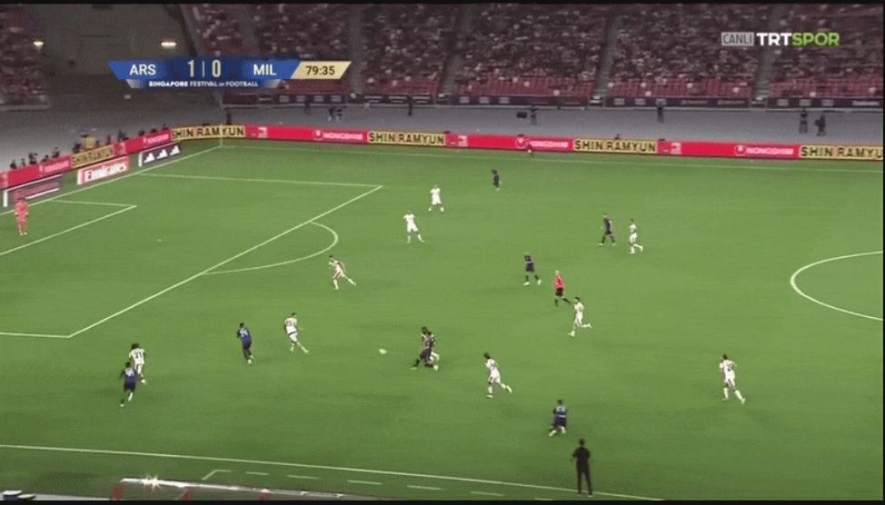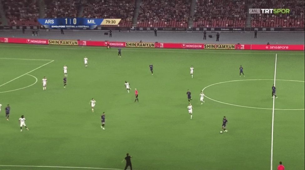 در صحنۀ زیر مقابل میلان، برای مثال، او بهعنوان عقبترین هافبک شروع میکند و پشت دو مهاجم حریف باقی میماند. اما سریع به سمت میکل مِرینو حرکت میکند هنگامی که او پاس را در حالی که پشت به دروازه است دریافت میکند، از نقطه کور عبور میکند و ماتیا لیبرالی، مهاجم نوک میلان، را پشت سر میگذارد.