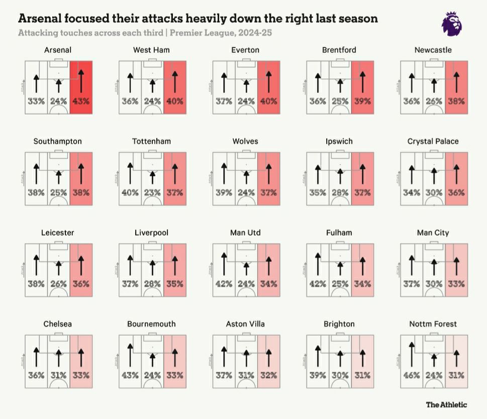 همانطور که در تصویر زیر مشاهده میکنیم، هیچ تیمی در فصل گذشته به میزان لمس توپهای هجومی آرسنال در یک سوم سمت راست زمین نزدیک نشده است؛ حتی با وجود اینکه مثلث خلاق بوکایو ساکا، بن وایت و اودگارد بخشهای بزرگی از فصل را به دلیل مصدومیت از دست دادند.
