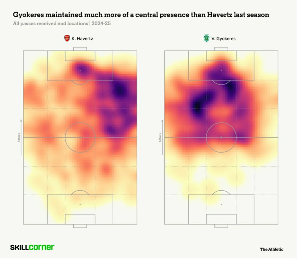 گیوکرس در فصل گذشته بهطور متوسط ۹.۱ لمس توپ در داخل محوطه جریمه حریف در هر ۹۰ دقیقه داشت، در حالی که این عدد برای هاورتز ۵.۱ بود، که نشان میدهد او میتواند در تمام کردن توپهای نزدیک به دروازه هم مؤثر باشد.