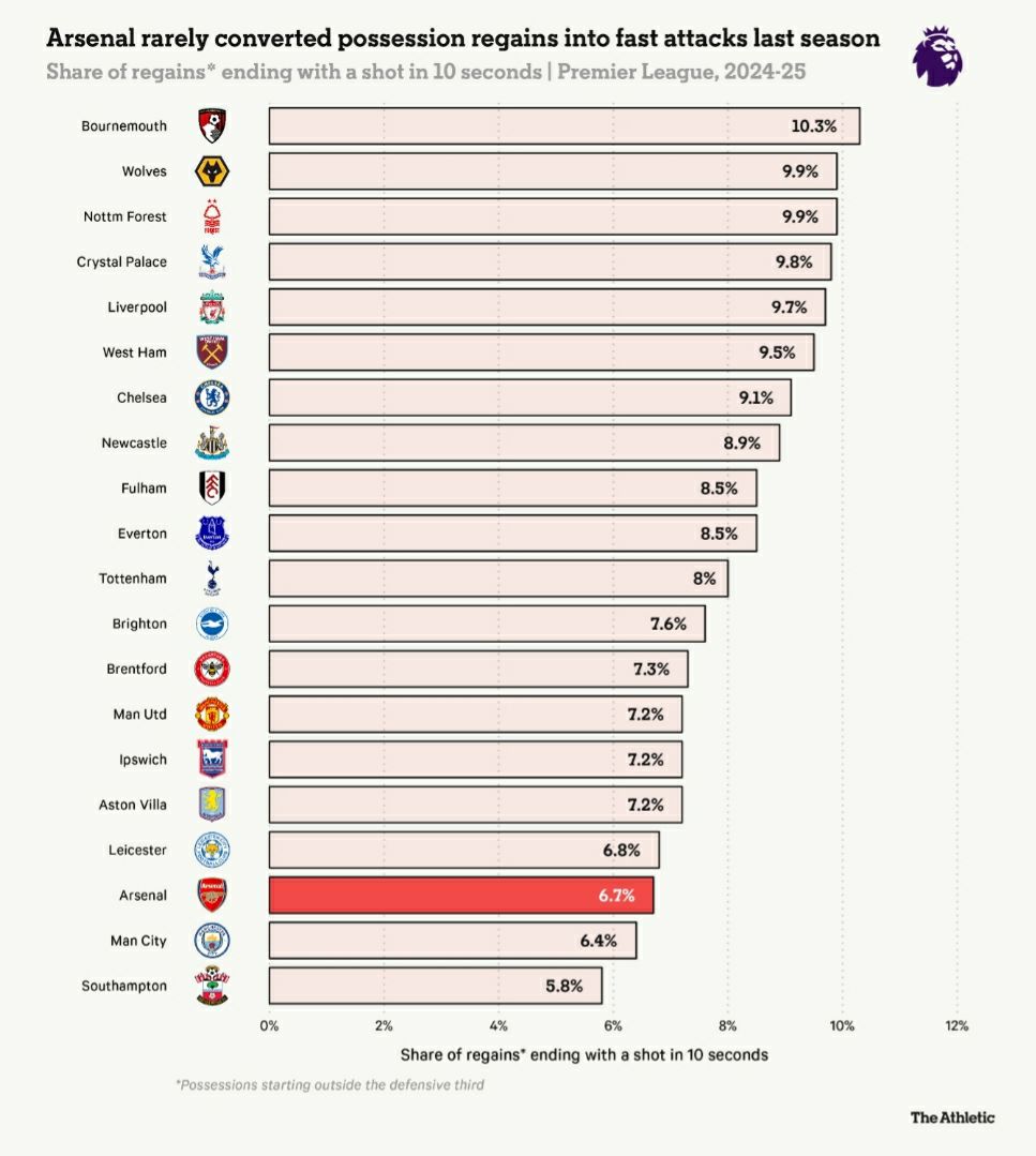 تنها بورنموث، نیوکاسل و لیورپول فصل گذشته بیشتر از آرسنال توپ را خارج از یک سوم دفاعی خود به دست آوردند، اما همانطور که نمودار زیر نشان میدهد، تنها ۶.۷ درصد از این توپها در عرض ۱۰ ثانیه به شوت منجر شدند که سومین آمار ضعیف در لیگ بود.