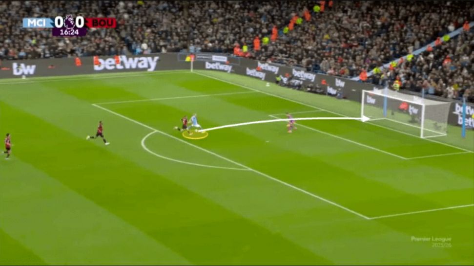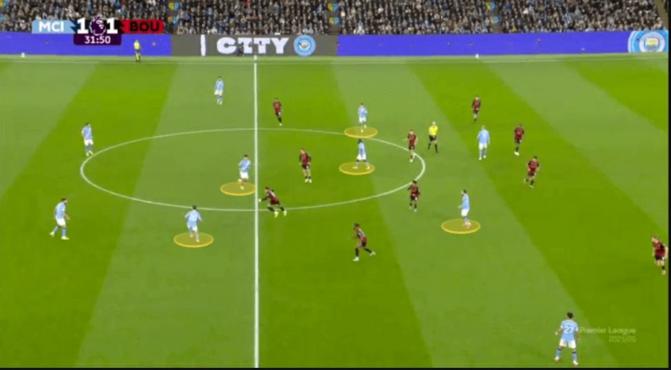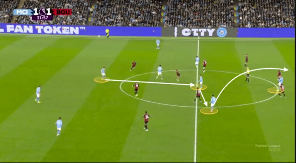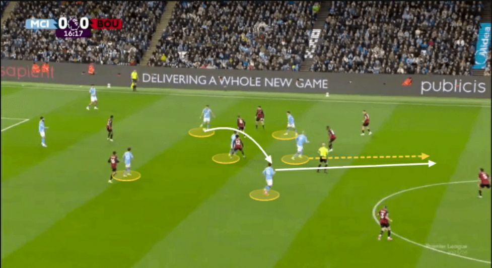 در پیروزی راحت ۳-۱ مقابل بورنموث، تیم او شکلی متفاوت داشت: سه بازیکن در کانالهای مرکزی باریک بین خطوط حضور داشتند تا مدافعان بورنموث را به جلو بکشانند و برای حرکتهای عمقی ارلینگ هالند فضا ایجاد کنند.