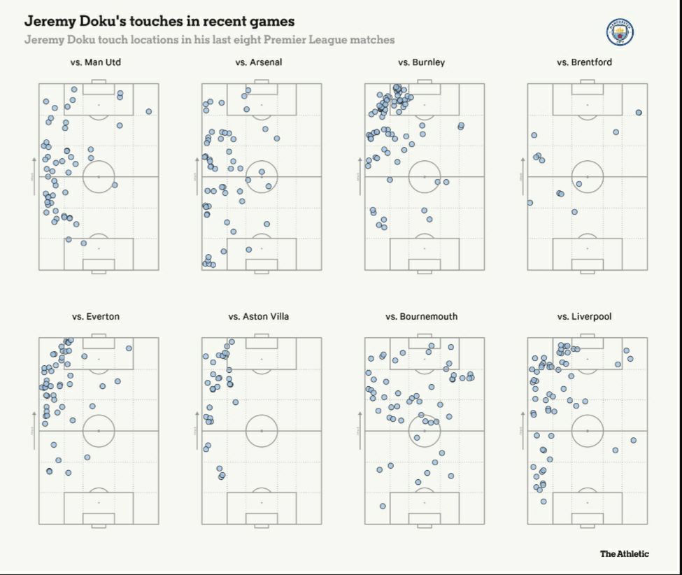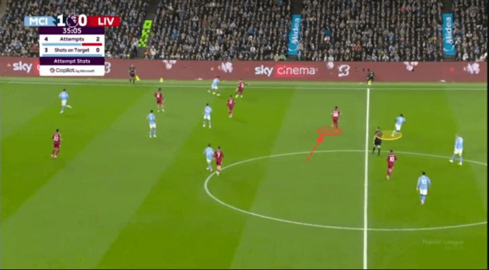 اما ناگهان دوکو دوباره در کنارهها دیده میشود. در واقع، او نیموینگر بود؛ نه کاملاً داخل بازی میآمد، نه صرفاً در خط کناری میماند. هرچند جایگیریاش تا حدی به موقعیت نیکو اورایلی در پشت سرش وابسته بود، اما آزادی بیشتری نسبت به گذشته داشت. او در کنارهها با سرعت از مدافعان میگذشت، اما در میانۀ زمین با حرکات مارپیچی از میانشان عبور میکرد. او مدام حرکات مورب ناگهانی انجام میداد؛ منتظر میماند تا مدافع راست لیورپول، کانر بردلی، به سمت اورایلی کشیده شود و سپس از فضای پشت سرش استفاده کند. این موضوع باعث میشد هافبکهای میانی لیورپول برای پوشش به آن سمت حرکت کنند و در نتیجه، فضا برای دیگر هافبکهای سیتی و برای هالندِ عقبکشیده باز شود.