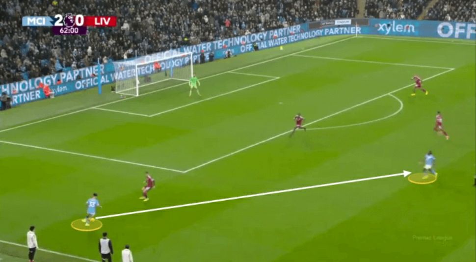 باز هم حرکت مشابهی انجام میشود: پاس مستقیم به جلو، سپس یک لمس از فودن و دوباره پاس در عمق از شرکی…