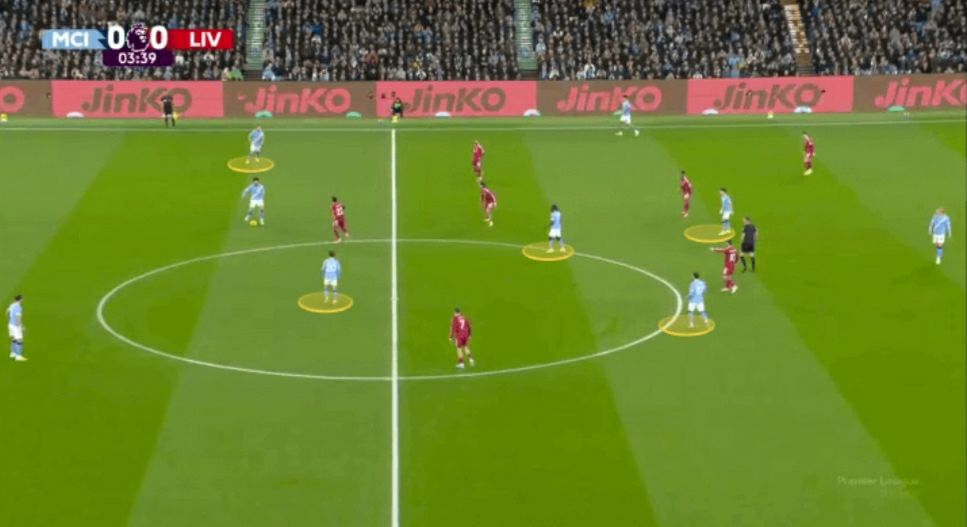 در صحنۀ منتهی به گل دوم نیز همان وضعیت دیده میشود؛ پنج هافبک سیتی کاملاً متمرکز در وسط زمیناند.